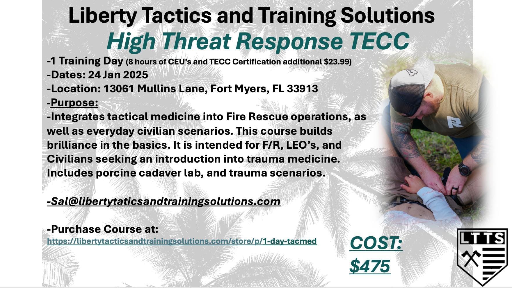 - 1/24 0800-1600 LTTS Tactical Trauma TECC (Open Enrollment: $475) See YouTube link at bottom of this page.